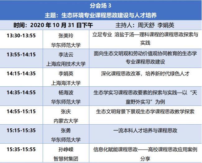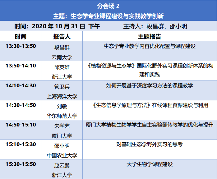 会场二围绕“生态学专业课程建设与实践教学创新”为主题开展报告和讨论。云南大学段昌群教授、浙江大学邱英雄教授、上海海洋大学管卫兵副教授、华东师范大学刘敏副教授、厦门大学朱学艺副教授、中国农业大学邵小明教授、浙江大学赵云鹏教授做主题报告。作为生态学专业的育人核心,课程建设和实践教学创新是生态学专业教师最为关心的话题,会场的7个报告从不同角度分析了生态学专业人才培养的特色和困境,并提出了相应对策和举措。