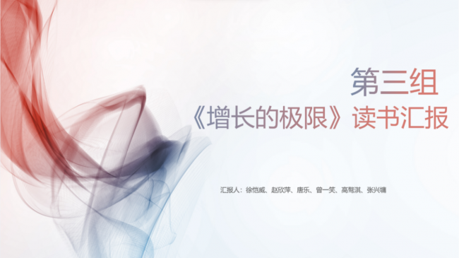 第三组分享的书目是《增长的极限》。徐恺威同学介绍了该书的背景,它是罗马俱乐部关于人类困境的研究报告,所阐述的“合理的持久的均衡发展”为孕育可持续发展的思想萌芽提供了土壤。其他组员分别从指数增长的极限、世界系统中的增长、生产技术增长的极限和全球均衡的状态四部分发表了自己的见解与思考。