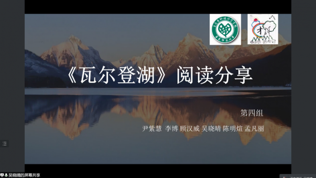 第四小组对《瓦尔登湖》进行了深刻解读。尹紫慧同学从作者介绍、写作背景、内容介绍和部分章节梗概四个方面简要地介绍了这本书籍。孟凡丽同学认为这是一本属于夜晚的书,白天是看不进去的,读来也会平淡无奇,但在宁静的夜晚读这本书,就会感到“字字惊人、语语闪光、感我肺腑、沁我心脾”。