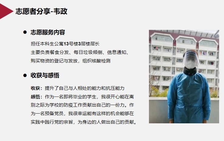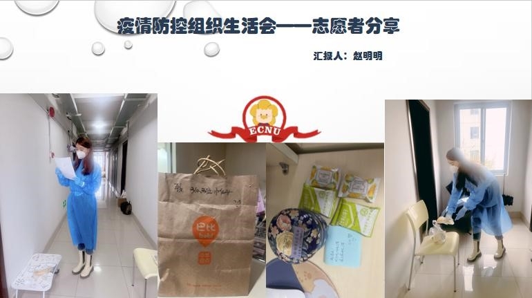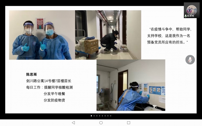 会中,支部的陈文丽、张晓婷、袁育鑫、赵明明、陈思雨、韦政以及周茉桐同志分享了他们在此次抗击疫情过程中的志愿者经历。虽然疫情志愿是一个非常辛苦的工作,但他们表示,在疫情中帮助同学、支持学校是作为党员应有的担当。在为大家服务的时候,也从他们的言语行动中获得了正向反馈。陈文丽同志表示:“虽然疫情这样的灾难发生了,但是人和人的关系变近了”。