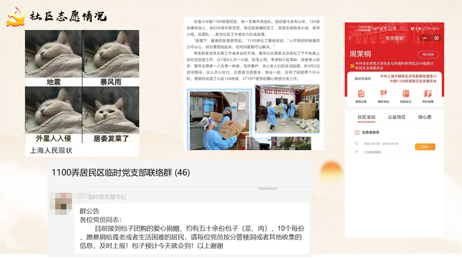 会上,支部书记周茉桐带领支部党员学习了习近平总书记在3月17日主持疫情防控会议时发表的重要讲话,与支部党员明确了总书记对疫情防控科学部署做出的指示,强调了我们国家防疫工作始终坚持人民至上和生命至上。同时,回顾了中共上海市委发布的《致全市共产党员的公开信》,信中指出党员同志应该亮身份、见行动,披坚执锐、攻坚克难,深入基层、深入群众,传播正能量。