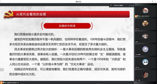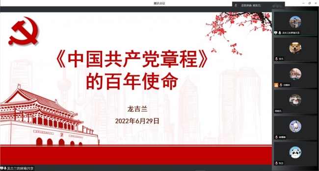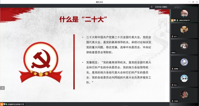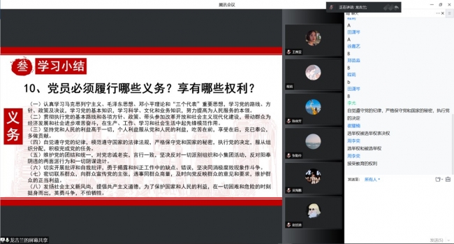 欲知大道,必先为史。恰逢中国共产党党章制定100周年,龙吉兰同学带领大家回顾党章内容,总结了若干有关我党的基本知识点:如党的性质、行动指南、入党誓词内容等,用多个问题串联的方式引发大家的思考。在最后学习小结部分,用党史知识选择题、填空题与同学们开展互动,大家都踊跃的在聊天框内进行文字交流,共同回顾先前提及的基本知识点,理清中国共产党党章内容的脉络。