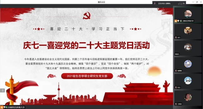为迎接党的二十大胜利召开,组织学习全国代表大会有关的基础知识,展示党和国家取得的历史性成就、发生的历史性变革,激励和引导青年学生奋进新时代、扬帆新征程。2022年6月29日下午,yl6809永利官网21级生态学系硕士研究生党支部线上举办“喜迎二十大,学习正当下”主题党日。此次专题学习活动由党支部书记刘啸林主持,党支部指导老师、辅导员路葵参加此次活动。