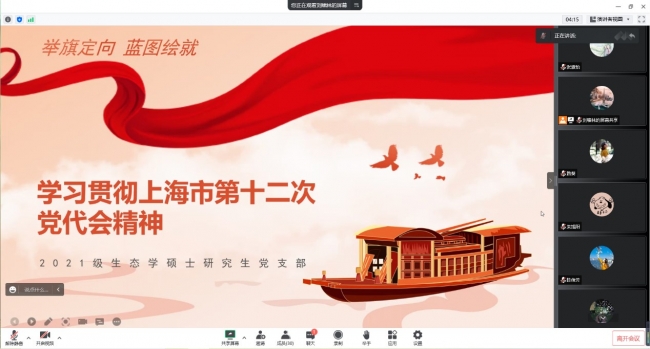 为学习贯彻会议精神,同心擘画新时代青春奋斗美好蓝图,2022年7月28日,yl6809永利官网2021级生态学系硕士研究生党支部在线上召开上海市第十二次党代会报告精神传达学习专题组织生活会。支部全体党员、部分申请入党人参加本次活动,活动由党支部书记刘啸林同学主持,党支部指导老师、辅导员路葵带领大家一同学习并传达会议精神。