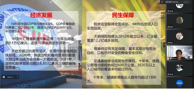 主题团日分为两个部分进行。第一部分,主持人沈立淳以视频结合讲解,从经济、民生、科技与生态四个方面系统阐述十八大以来的“新时代伟大成就”:经济发展迅速,GDP与外汇增长常年立足世界顶端;衣食住行保障到位,人民安居乐业;科学技术多点突破,基础研究与高尖技术都跻身世界前列;生态环境保护成效斐然,“绿水青山就是金山银山”的思想已经深入人心等内容。在讲述党的伟大成就中,唤起了与会团员的自豪感与身份认同感,大家感悟了新时代挑战与机遇并存的道理。