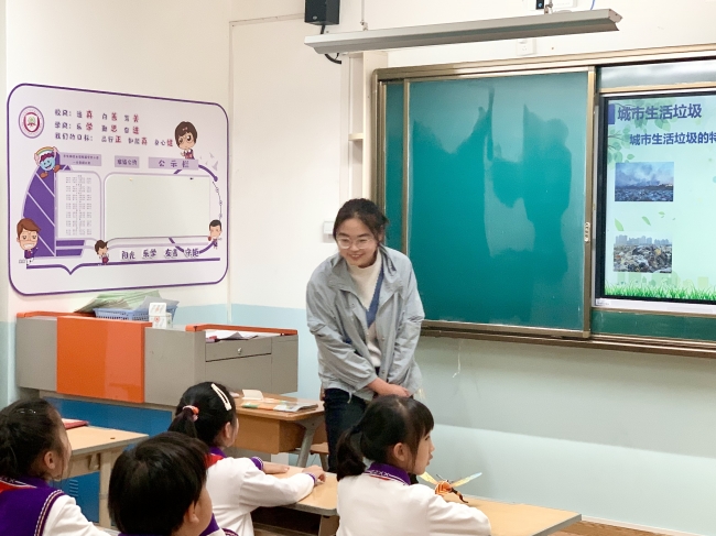 2022年11月22日、23日下午,yl6809永利官网生态环境小课堂讲师团和团委学生会实践部的成员们前往华东师范大学附属紫竹小学和永德实验小学开展垃圾处理环教课,担任本次课程的讲师为李凯茵同学、尹颖同学、陶建平同学以及戴紫铃同学。