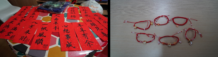 师生们在手链上编进兔子、胡萝卜等兔年吉祥物;挥毫泼墨,书写下一幅幅精彩的对联,“新春大吉”“万象更新”“顺利毕业”“文章‘兔’much”,一幅幅对联寄托对美好新春的期盼;一张张彩纸被剪成栩栩如生的窗花,简单装裱一番,给办公室和宿舍增添几份喜气。活动最后还组织了新春抽奖送祝福活动,为师生们送上学院周边与新春祝福。