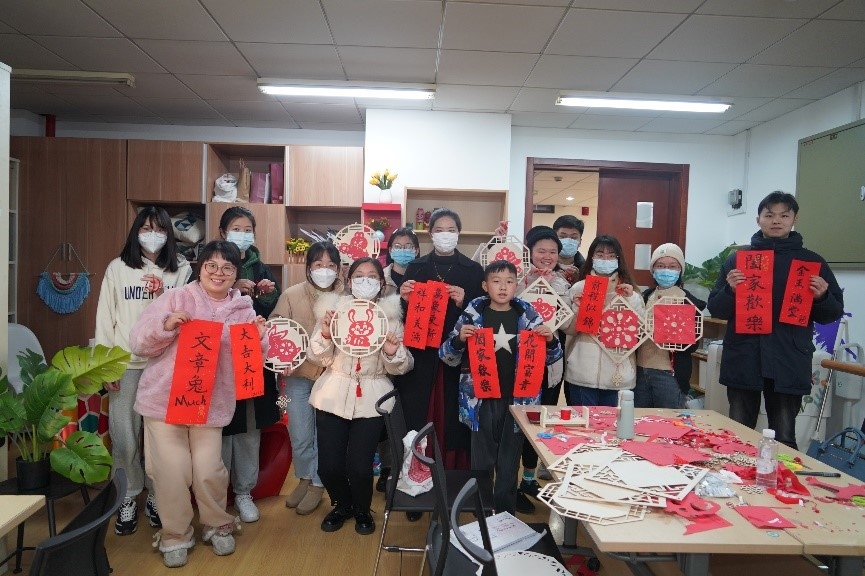 活动共分为三个环节:剪窗花、编红绳、写对联。参与师生们分为三组,轮流体验各项手工项目。