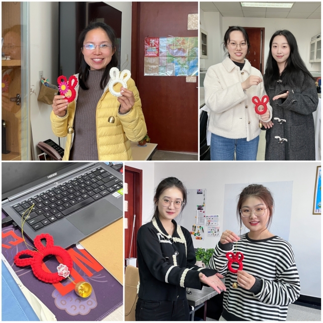 活动伊始,路葵老师向大家详细讲解了手工编绳的步骤和技巧,几根平平无奇的棉绳在各种交叉缠绕中,“诞生”一只只可爱的小白兔、小红兔,再配上一个小铃铛,叮当作响的兔年小挂件就做成了。挂在窗前门口或者包包上,都是一个让人心情愉悦的小饰品。
