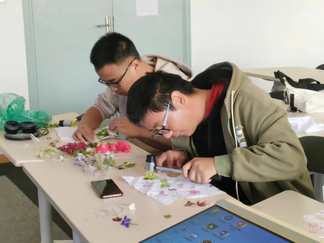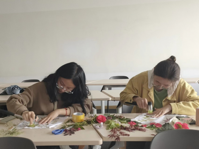 在工作人员简单介绍植物拓印的“采”“固”“敲”三步骤后,大家纷纷开始创作,教室里“咚咚咚”的声音此起彼伏。
