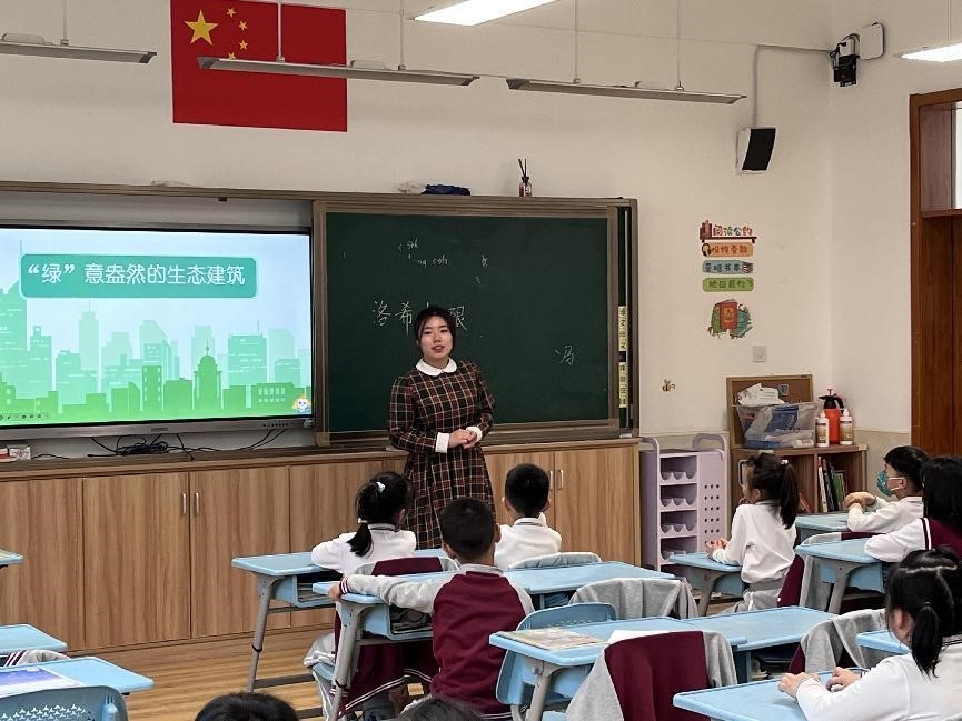 讲师们介绍了上海市生态建筑示范楼,抛出问题:“这栋建筑包含了哪些生态设计亮点?”让同学们展开讨论。同学们学以致用,踊跃举手回答并十分迅速地识别出建筑的生态设计及其作用。最后,讲师们通过米兰垂直森林的科普短视频,介绍了生态建筑的另一种形式——垂直森林的特点及优缺点,并提出:“你愿意住在生态建筑里吗?愿意或不愿意的原因是什么呢?”同学们在思考后积极举手分享自己的想法。