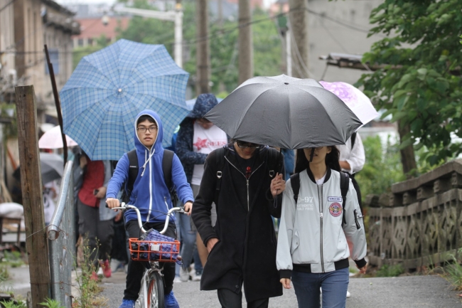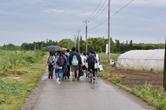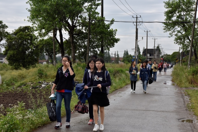 结束第一个采样点的测定后,同学们走出校园,步行至虹梅南路紫凤路,在队伍中也不时会看到一辆单车。穿过友爱村,同学们沿路观察此处村庄和农田的环境状况,主要包括大气状况、水质状况、生活垃圾堆放情况、噪声污染状况、生态环境情况等,同时在农田中的一座小桥处测量新蒋家港水质情况(注:这条河与学校图书馆草坪前的校河直接相连,距离约1公里)。