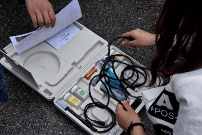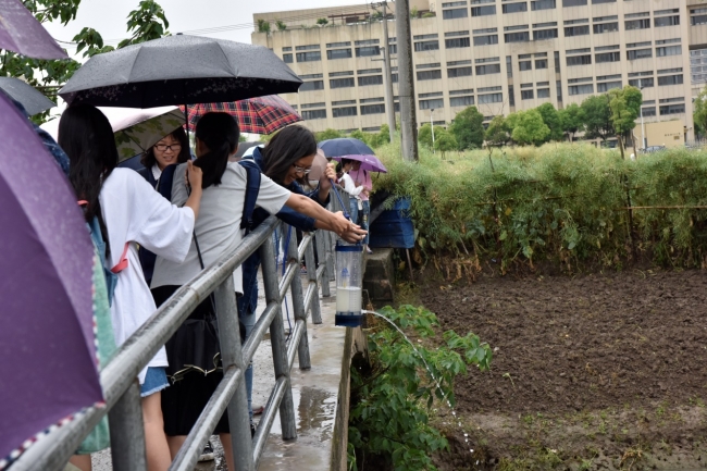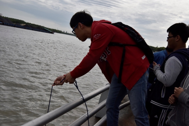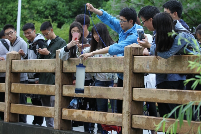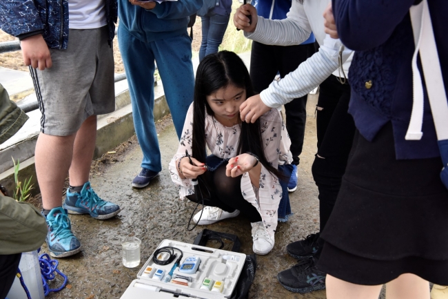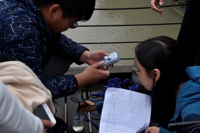 13:00左右,大家集体出发前往我们的第一个采样点检测樱桃河的水质。第一个采样点在校内生态岛附近,同学们在桥上用取水器取样后检测。大多数同学是第一次使用水质检测的仪器,认真操作之余也带有几分激动与好奇。