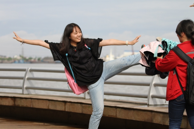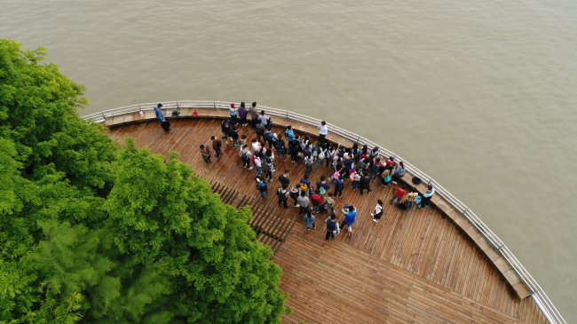 一路欢声笑语,伴着雨后的阳光和清新的空气,同学们很快就走到了滨江公园。 滨江公园位于黄浦江防汛堤坝上,沿着黄浦江大约有2公里长,将生态设计、生态工程与防汛堤坝结合在一起,建成了长长的亲水平台、长堤和栏杆,既给人以视觉的美感又让人们可以亲近河流、亲近自然。人们可以在公园里垂钓、玩耍,这大片的绿地是城市中少有的静雅之处。