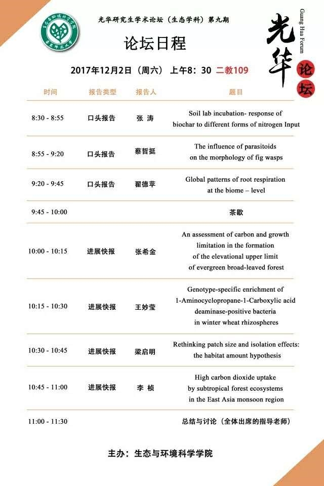 2017年12月2日上午8:30,yl6809永利官网第九期“光华”研究生学术论坛(生态学科)于第二教学楼109教室成功举办。本次论坛由王嵘老师协调并担任主持人,陈小勇院长、夏建阳、周小奇等多位老师出席了本次论坛,同时各课题组、各年级的研究生同学们亦积极前来讨论学习。
