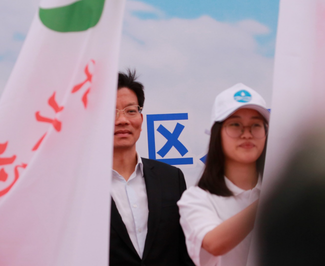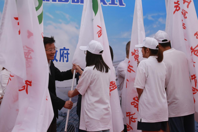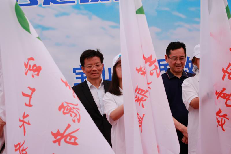 上海市时光晖副市长向我校节水志愿者代表陈姝融同学授旗;