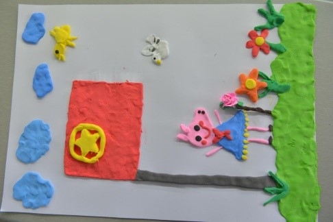 第三组的作品主体是佩琪和团旗,佩琪象征着新一代的青年,在团旗的指引下前进。白色的鸽子象征着和平,各种不同的花象征着五十六个民族,而四片云朵和五朵花又象征五四青年。图中缺少了太阳,说明团旗散发着的光芒足以引领青少年前进。
