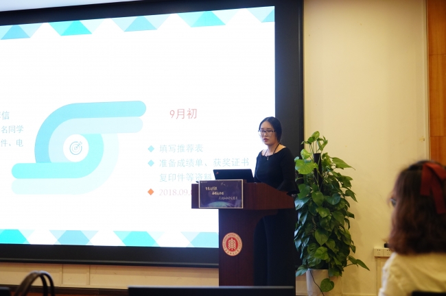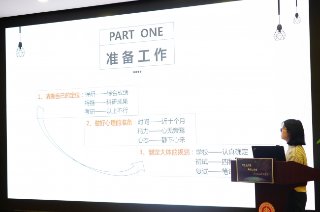 晚上6:00,直研考研经验分享会准时开始。活动由路葵老师主持发言,并为大家分析了近年来学院同学的推免情况、考研率等,为活动构建了总框架。随后,分别由各位优秀的新晋研究生为大家传授经验。