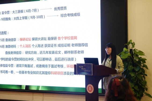 接下来,李欧阳同学和王正宇同学为大家分享了她们的保研经历。李欧阳同学通过普通推免直升北京大学环境科学与工程学院。她介绍了夏令营的流程,包括查询信息、准备材料、参加夏令营。并且分享了她参加复旦大学和北京大学夏令营的经历。王正宇同学通过普通推免直升同济大学环境科学与工程学院。她介绍了她参加东南大学能源与环境学院、南京大学环境学院以及同济大学环境科学与工程学院9月推免的经历,并且给出了她的个人意见:准备好个人简历和个人介绍PPT,务必提前联系导师、密切关注心仪院校研究生院、学院官网、保研论坛等网站。