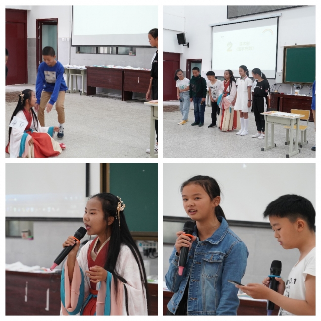 小朋友们组成“小戏骨”团队为大家表演了语文课堂上所学的“滥竽充数”的故事,熟练的台词,娴熟的表演动作,引得大家阵阵掌声。歌曲串烧节目中,首先李鸿雁小朋友身穿一身飘逸汉服为大家歌唱了一首古风歌曲《九万字》,每个人都陶醉在她美妙的歌声中,仿佛置身于仙侠世界;还有季锐敏和詹建东一首魔性神曲《学猫叫》,活泼可爱的曲风将气氛带到了高潮,吴承坤以沉稳的嗓音歌唱一首《东西》,引得大家不约而同为他打起了节拍。