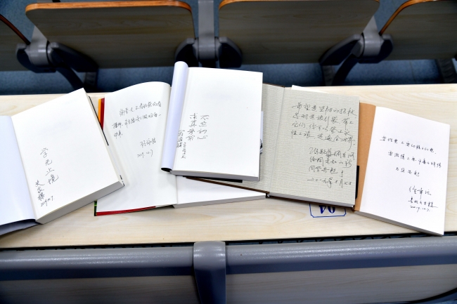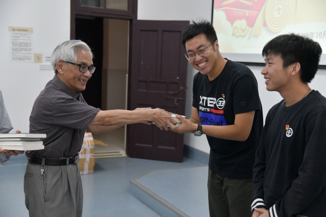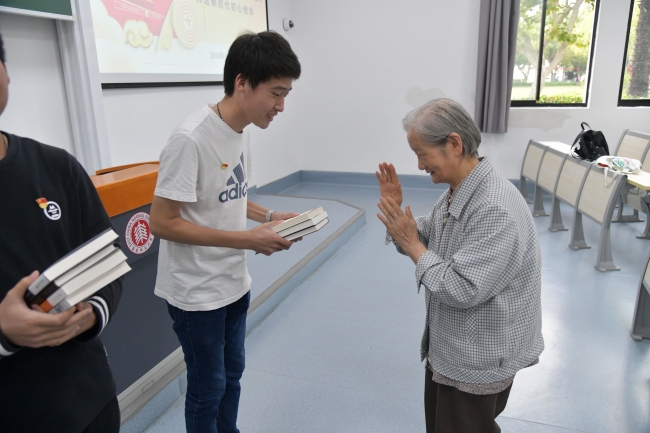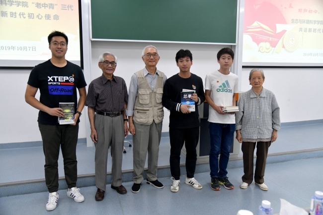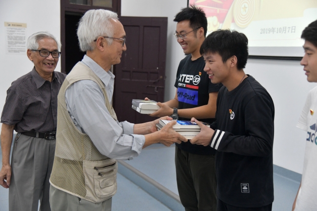 活动最后一个环节是退休教师为学生党员赠书的仪式,每位退休老师都提前将自己对同学们的真切期望浓缩在所赠之书扉页的寄语中,希望同学们可以不忘初心,牢记使命,认真学习,为学院、学校和国家的发展做出自己的贡献。退休教师代表翁恩琪、史家樑、韩玉莲老师将一本本饱含老一辈生环人对年轻一代生环人期望的书籍赠给了学生党员代表们。
