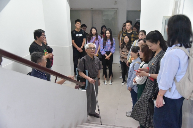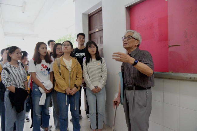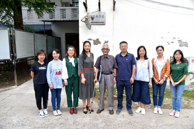 到达环科楼后,全体师生党员在环科系前系主任翁恩琪老师的带领下,参观了yl6809永利官网的前身环境科学系所在的环科楼。一入门就感受到了浓浓的年代感,在翁老师绘声绘色的介绍下,同学们感受到了这不仅仅是一座普通的三层小楼房,而是承载着生环人奋斗历程和无尽回忆的地方。翁老师虽已年过80,但是对于环科楼的一草一木却都记忆犹新,在他的详细介绍下,同学们仿佛来到了三十多年前,看到了当时年轻的老师带着一群朝气蓬勃的学生在艰苦的条件下从事着科学研究。走过楼道转弯处时,翁老师说,“以前我们在环科楼的每层楼梯间都安了一块衣冠镜,老师和学生进了环科楼,无论是进课堂还是进办公室、实验室前都得整理好仪表,这是一个规矩,也提醒我们老师和学生身上的责任”。老一辈科研工作者严谨的作风和深深的使命感,在这些小事中体现的淋漓尽致。通过在环科楼的参观学习,老师和同学们了解了yl6809永利官网从一穷二白到发展壮大的奋斗历程,对老一辈环科人艰苦奋斗、团结一心、无私奉献的精神充满了无限敬意。