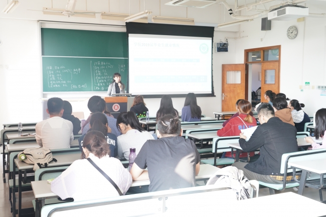 活动伊始,学院毕业班辅导员吴丹老师向在场同学介绍了学院2019届本科生以及硕士、博士研究生的毕业去向情况。伴随国家对生态环保领域的愈加重视,学院总体就业情况也相较往年有一定提升,本科生的继续深造率比较高,学院也鼓励学生继续深造,相较而言,硕士就业专业对口度有明显提高。在介绍完学院目前就业形势后,吴丹老师也从职业生涯规划、求职心态调整、求职准备、求职渠道、求职视频以及相关求职网站等方面,详细地向在场同学给出了求职建议。学院党委副书记路葵老师对学院毕业生就业情况进行了补充,路老师向在场同学解释了2019届本科毕业生的就业详细情况,并列举了2018届的本科毕业生数据来进行对比,更为详细具体的数据与实例也让在场同学对目前学院的就业情况有了更深入的了解。