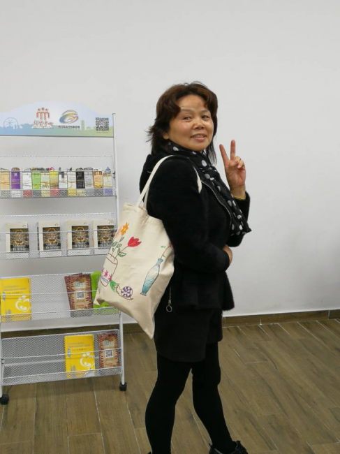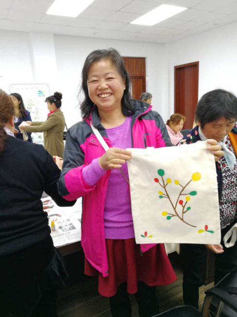 同一天的第二节课程,内容为环保帆布袋的绘制。由生环团队提供环保帆布袋,老人和孩子们在其上作画。大家发挥着各自的想象力,沉浸在创作的愉快氛围当中,转眼就到了下课的时间。老人和孩子们的独特创意,化为精致漂亮的画作装饰着帆布袋,背着这“环保时尚”的帆布袋,老人和孩子们开心地进行了合影。