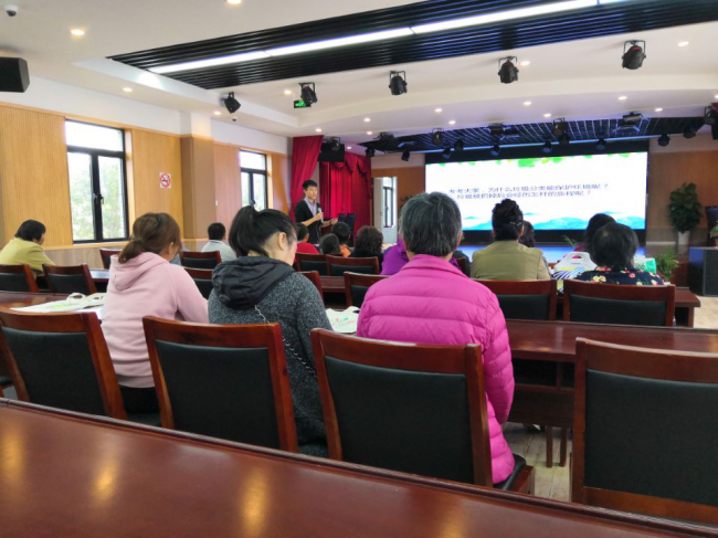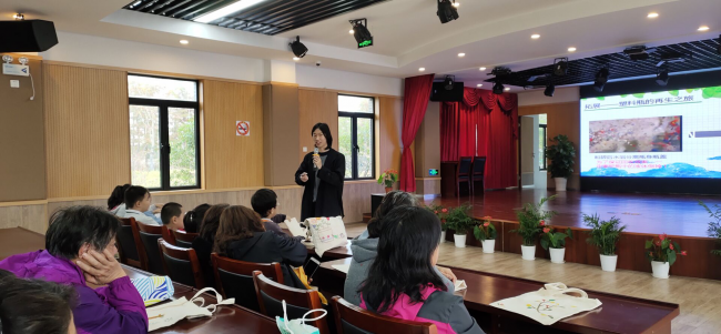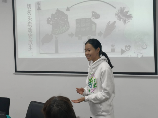 第三节课的主讲人为团队成员曾艾群,她以生活中因善心的放生行为切入点,讲述了入侵物种对环境的危害,启发老人和孩子们,放生这种看似善举的行动,可能也会招致对环境的破坏。同时,老人和孩子们也惊叹于餐桌上常见的牛蛙、小龙虾等,都是入侵物种。同时,曾艾群还讲到了科学放生的概念,说明放生要讲究时间、地点、环境,告诉老人和孩子们不能闹出放生反而是害了小动物的笑话。