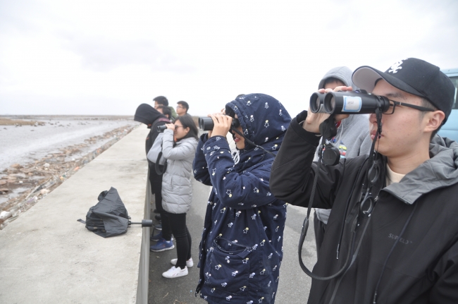 下午14:00,同学们到达上海崇明东滩鸟类国家级自然保护区。在保护区科研人员的带领和指导下,同学们来到保护区生态修复大堤,实地参观了东滩保护区的生态修复区。随后,同学们使用望远镜观测滩涂上栖息的鸟类。正值高潮位,滩涂上有数以千计的水鸟在栖息觅食,短短半个小时,大家便观察到了黑腹滨鹬、灰斑鸻等十几种鸟类。