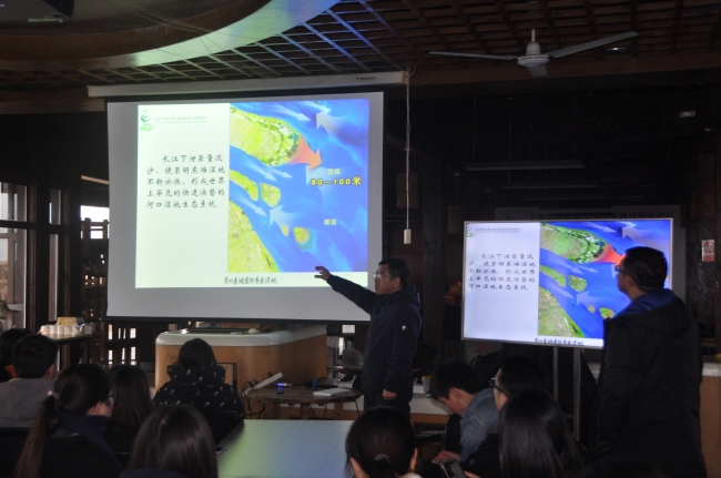 保护区冯雪松老师为同学们介绍上海崇明东滩鸟类国家级自然保护区《互花米草生态控制和鸟类栖息地优化工程》,详细地讲解了崇明生态修复工程背景、意义和成效,让同学们充分了解到崇明东滩保护区近年来开展的生态修复工作。针对冯老师的讲解内容,同学们结合《湿地生态学》课程学习内容,踊跃地提出自己的思考和疑惑,冯老师也一一讲解回答,形成了良好的讨论互动。随后,同学们观看了关于崇明东滩生态修复工作的纪录片,对东滩生态修复工作有了更加深入的了解。