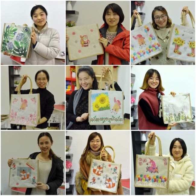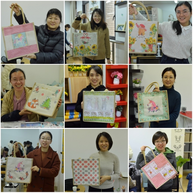 大家在一起总是欢乐的时光,不到两个小时,一个个精致美丽、创意满满的帆布袋就完成了,拿着自己亲手制作的帆布袋美美地拍张照,留好这美好的时刻。