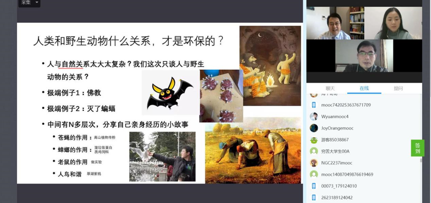 张勇老师从环境保护看野生动物问题、突发事件中的恐慌与理性和口罩使用的全生命周期观点这三个部分讲解,何德富老师介绍了环境与人体健康——食物篇,陆文洋老师介绍了环境问题观察MOOC等内容。