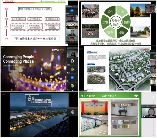 在单位宣讲环节,十家宣讲单位主要从公司简介、特色项目及人才需求展开介绍。上海辰山植物园的商侃侃老师介绍了植物园研究定位、研究方向、学科布局等;上海市园林科学规划研究院的郑思俊老师介绍了园科院的规划设计资质和项目情况等;AECOM艾奕康规划与设计(深圳)有限公司上海分公司的张丹华老师介绍了公司创新、多元、灵活的人才培养计划等;上海勘测设计研究院有限公司的崔易翀老师介绍了公司的发展历程、业务范围、服务领域等;上海复旦规划建筑设计研究院有限公司的涂俊老师介绍了公司的核心业务等;上海市建设用地和土地整理事务中心的王洁华老师通过带领同学云游中心,介绍了单位整体情况及实习岗位需求等;上海航道勘察设计研究院的吴创收老师介绍了企业概况、企业资质、组织架构等;上海水利工程设计研究院的戴雅奇老师介绍了公司的典型案例等;上海化工区物业管理有限公司的王颖老师介绍了公司的品牌特色等;中国海螺创业控股有限公司的老师介绍了公司的人才队伍、经营业绩、主营产业等,并表示未来几年内对生态环境专业有着大量的人才需求。
