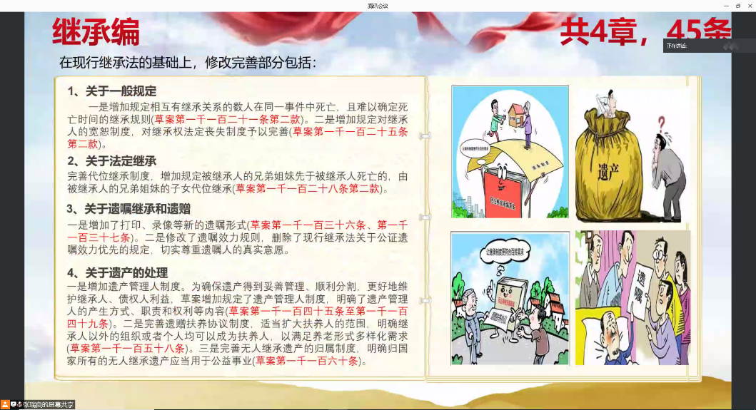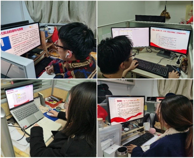 本次专题学习主要分为四个板块,从近代民法的建构与探索、新中国成立以来的民法发展以及新时代的中国民法典三个方面讲述民法典的前世今生;从编纂民法典的指导思想与五大基本原则两个部分解释编纂民法典的总体要求与基本原则;按照民法典的总则编、物权编、合同编、人格权编、婚姻家庭编、继承编和侵权责任编等七编阐述民法典的主要内容及相对之前法律法规的主要区别与亮点。选取见义勇为、以房养老、合同情势变更和小区业主维权等四个热点问题进行案例解读。为检验学习效果并激发同学们的学习热情,班委还特别设计了《民法典》线上知识竞赛。