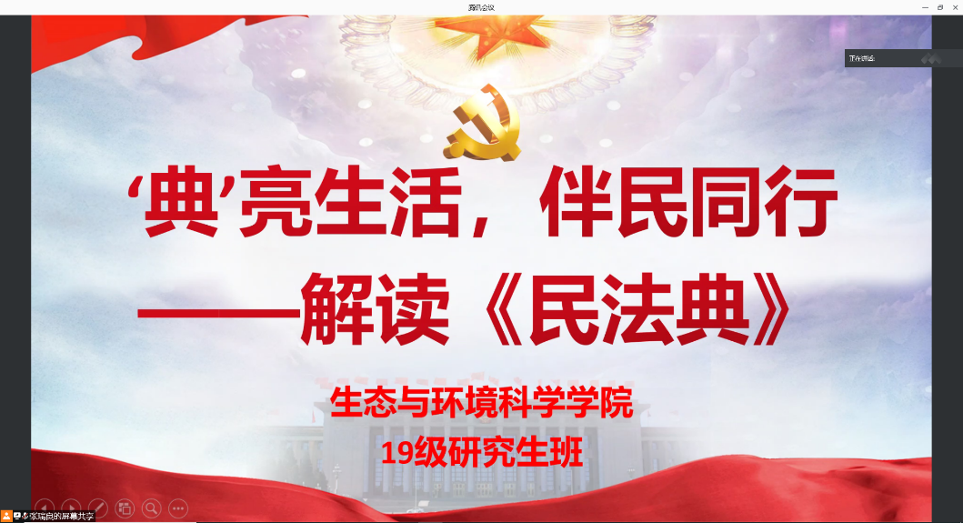 为认真学习贯彻习近平法治思想,深入贯彻落实党的十九大和十九届五中全会精神,切实推进《民法典》贯彻实施,进一步增强学校学生尊法、学法、守法、用法意识,yl6809永利官网19级研究生团支部于2020年12月15日晚线上开展“典亮生活,伴民同行”《民法典》专题学习活动,活动由环境科学系班长张瑞良主持,带领支部同学学习民法典的“前世今生”、基本原则、主要问题和热点问题,辅导员路葵老师参与本次活动。