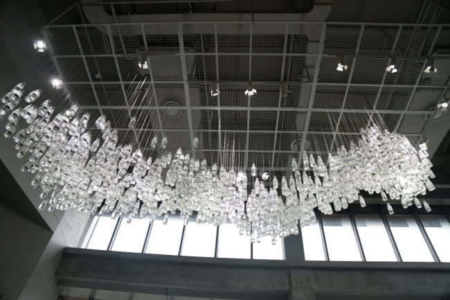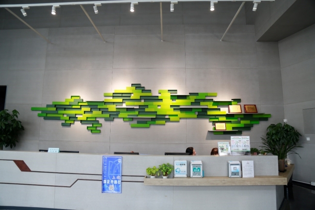 大厅中,头顶的大型艺术吊灯是由废旧玻璃瓶制成的,门厅背景墙上的绿色山水概念雕塑是由回收金属板再利用装饰的;展厅内使用的装饰木板有约一半是由回收再生材料再利用制成;光照则是由屋顶的太阳能光伏发电板提供。