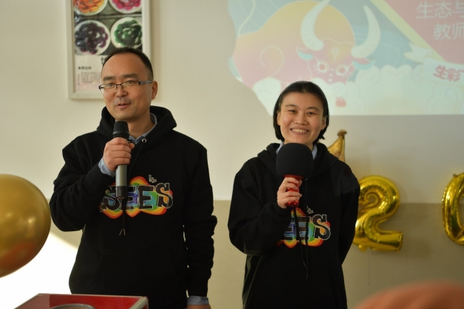 活动首先播放了2020年大事记视频,回顾了一年来学院开展的各项工作和活动。突如其来的新冠肺炎疫情给我们的工作和生活带来了不小的影响和改变,却丝毫没有影响生环人奋斗的脚步,这一年,我们克服困难,力争突破,砥砺前行,取得了累累硕果。大事记播放结束后,学院领导班子走上台前,向在场所有的教职工送上美好的新春祝福,在祝福中特别加上了2021年牛年的“牛”元素和包饺子活动的“饺”字谐音元素,让美好的祝福更多了一些趣味。副院长周天舒祝大家“‘牛’气冲天、‘饺’龙下海”,副书记路葵祝大家“‘牛’刀小试、崭露头‘饺’”,党委书记刘婕祝 大家“‘牛’运当头、生态环境学科‘饺’相辉映”。