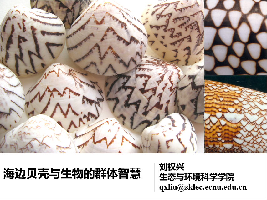 刘权兴老师以“海边贝壳与生物的群体智慧”引入,通过海螺的旋转螺纹、植物茎叶的回旋卷曲等大自然中的现象介绍了图灵结构的由来。从介绍早期对于贝壳花纹形成原理的研究,刘老师引出了生态系统自组织的概念。刘老师举出了很多的例子,如蚊子、蚂蚁、石头的自组织行为,尤其是老师播放的关于羊的集群行为的视频引起了大家极大的兴趣。