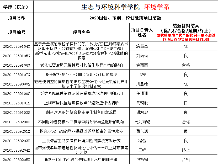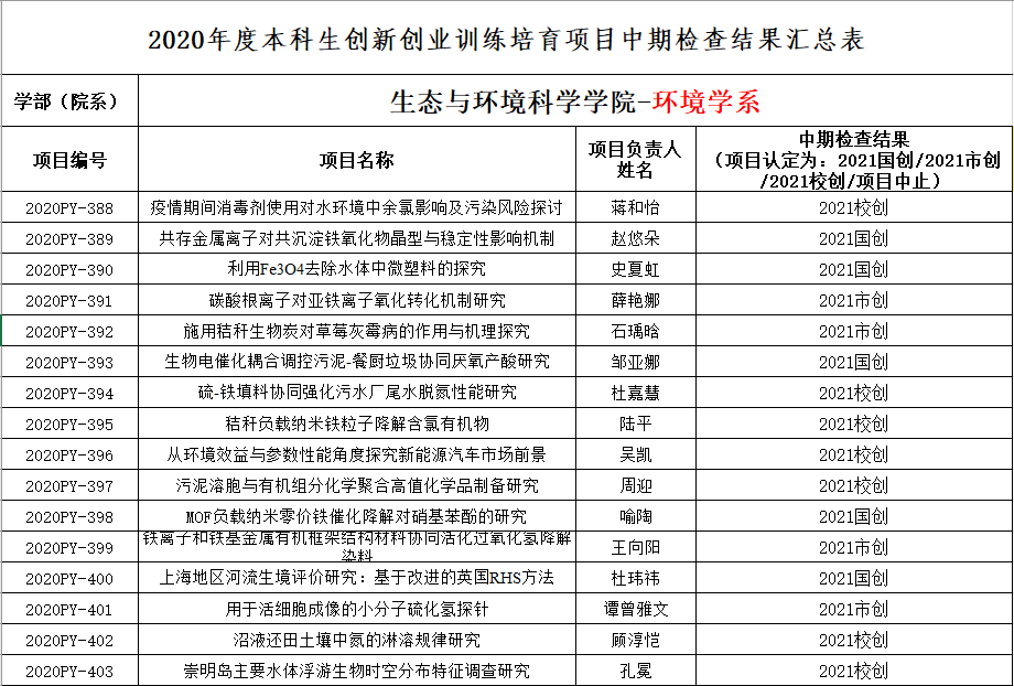 2021年4月6日-7日下午,yl6809永利官网开展了2020年度本科生 创新创业训练培育项目的中期检验以及2020年国创、上创、校创项目结题验收评审会。因去年疫情影响,原定2020年底结题的项目延期至今年验收,故本次评审会项目数达46个,分3场进行,分别为:6日下午1:30,在资环楼435室召开环境学系延期项目结题验收评审会,评审老师由王兆慧、何岩、陆雪琴组成;7日下午1:00,在资环楼234室召开环境学系中期检验评审会,评审老师由邓晶晶、徐娟、马黎萍组成;7日下午1:00在资环楼435召开生态学系中期检验和结题验收评审会,评审老师由李媛媛、邢丁亮、晏黎明组成。