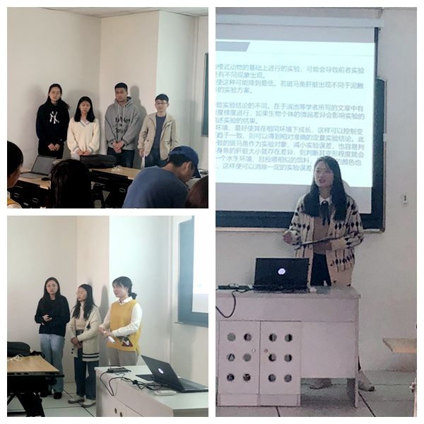 本次公开课围绕3组学生汇报自主设计的实验方案展开。王向阳组以“酸雨条件下不同浓度重金属Cr6+对上海青早期发育的影响”为选题,蒋和怡组以“对苯二胺对成年斑马鱼的碱性磷酸酶的影响”为选题,石瑀晗组以“VC对甲基异噻唑啉酮所致的斑马鱼胚胎发育毒性的保护作用”为选题,分别介绍了选题背景、实验方法、预计实验结果和可能出现的问题。同学们和老师对实验方案进行提问和点评,气氛热闹,问题不断,通过“问”和“答”,引导学生深入思考方案的可行性及一些细节问题,帮助学生进一步完善方案。