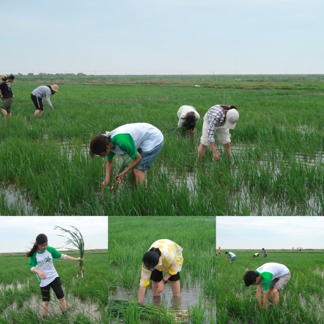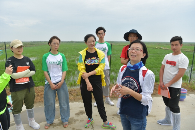 朱正芝(19级环境生态工程专业本科生):“从华师大来到了崇明东滩,一下车就能看到郁郁葱葱的水稻,长势喜人,从上一次的推送中看到播种种子才不到一个月,这也太快了。但是其间的杂草长的更加旺盛,大家光脚踩在软软的水稻田间,一棵棵拔出正在与水稻争夺养分的杂草。斩草要除根,我们还不能光靠蛮力,得慢慢拔,不然拔断了根部还留在土里,过段时间还会再长出来。抱着一堆堆杂草走向田埂,我的心里也有了一种欣慰和期待,想着它从播种、萌发、生长、成熟到成为餐桌上香喷喷的米饭,不禁赞叹生命的奇迹与劳动精神的伟大。身为农业大国,我国有千千万万的劳动人民都在做和我们今天一样的工作——用双手守护那一株株绿色。”