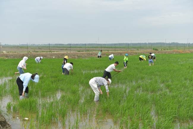 经过农户的简单指导,刘婕、路葵等老师首先下田,带头为同学们作劳动示范。同学们也迅速撸起袖子,卷起裤脚,纷纷踏入水稻田中开始了除草劳动。顶着江滩吹来的劲风和云后射下的阳光,大家有条不紊、一丝不苟地进行着劳动,有的负责将杂草连根拔起,有的负责将杂草搬运至田边,在不知不觉间汗水已滴入脚下的土地,浇灌着希望的秧苗。经过一个多小时的共同努力,约十五亩早稻试验田中的杂草被清除干净。看着绿油油的稻田,同学们体会到了劳动所带来的喜悦和幸福感,希望用辛勤劳动换取“幸福生态米”的丰收,也在身体力行中加深了热爱土地、珍惜粮食的感触。