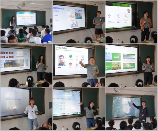 在两个高中班级中,路葵和瞿轶雯老师分别介绍了华师大和yl6809永利官网的情况,播放了2021年华师大的招生宣传片《圆的故事》,一段通过手绘漫画讲述不断认识自身、不断拓宽认知边界的故事,鼓励高中生们要不断成为更好的自己,接受更广阔世界的光,看到更大的世界。金泉泉、尹世浩等6位学生分为两组在两个班级开展“走近大学生”板块的分享,他们结合自己的高中和大学学习体会分享曾经的困惑和“豁然开朗”的心得。汪艺洁、林彤等8位同学分为两组在两个班级开展“生环小课堂”板块的分享,他们结合两周以来实践课程中的收获分享了自然的魅力、动植物的奇妙“智慧”、野外调查研究中无人机和红外相机等技术的有趣运用等,带领高中生体验一段“探索自然之旅”。张健和斯幸峰老师分别在两个班级带领同学们领略了“自然是最好的学校”和“无限风光在险峰”,两位老师丰富的求学经历、精彩的实践探索、有趣的科研故事引得同学们掌声连连,短短几分钟就“吸粉”无数。