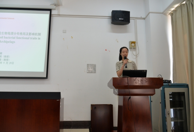 下半场第一个口头报告是来自由文辉老师课题组的杨安娜同学,她的报告题为《舟山群岛土壤细菌功能性状的生物地理分布格局及其影响机制》。研究调查与采样地点位于舟山群岛37个不同岛屿面积及隔离度的海岛,研究认为岛屿面积和隔离度通过土壤电导率和植物叶片性状的变异直接或间接影响土壤细菌能量代谢;土壤细菌性状的不同格局和机制表明,土壤电导率、叶片N:P、叶片C:P、土壤N:P和土壤C:P是细菌能量和养分利用变化的主要驱动因素。