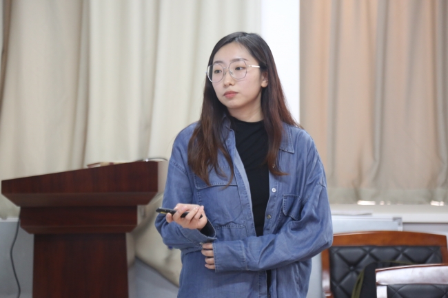 下半场第三位报告人,是来自邓晶晶老师课题组的罗雨昕同学,她的口头报告题为《无限配位聚合物纳米粒子实时监测碱性磷酸酶及其在藻华预警中的应用》。研究选择了两种具有相反发光特性的客体将其包裹进无限配位聚合物中,使得纳米粒子在荧光通道中同时具有AIE和ACQ的现象,为建立一种新型的实时比例荧光碱性磷酸酶测定奠定了基础。此外,除了光谱变化,其明显的颜色变化易于与智能手机集合,为数字藻华预警提供了可能。