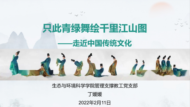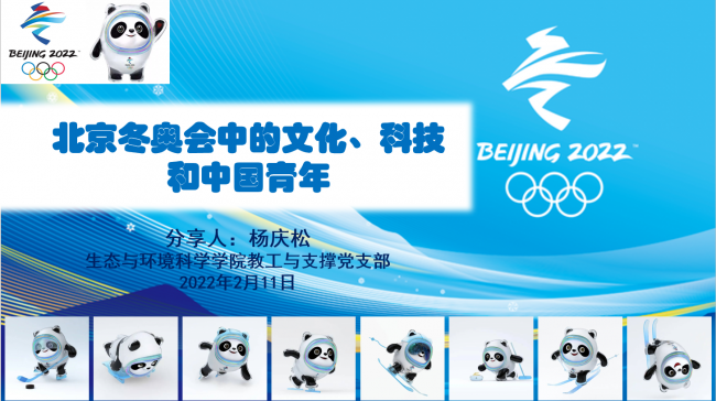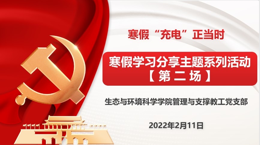 2022年2月11日下午,yl6809永利官网管理与支撑教工党支部举办第二场寒假学习分享主题活动,分享人是欧阳澳、丁媛媛、束亚男、杨庆松老师和施天慧同学。欧阳澳老师分享的主题是《新加坡都市农业带来的启示——从电影<我们的故事>谈起》、丁媛媛老师分享的主题是《只此青绿舞绘就千里江山图——走近中国传统文化》、束亚男老师分享的主题是《坚定四个自信,砥砺奋进——<厉害了,我的国>观后感》、杨庆松老师分享的主题是《北京冬奥会中的文化、科技和中国青年》、施天慧同学分享的主题是《京剧与传承》。