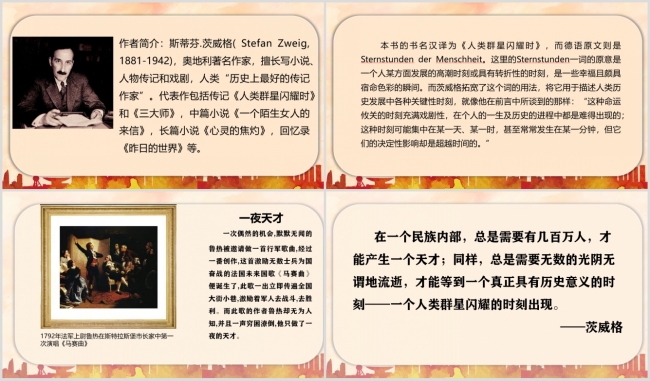 杨海波老师向大家推荐和介绍了奥地利著名作家茨威格写的历史传记经典《人类群星闪耀时》一书,并分享了自己的读后感想。这本书分别展现了14个决定世界历史的瞬间:千年帝国拜占庭的陷落、巴尔沃亚眺望水天一色的太平洋、亨德尔奇迹的精神复活、老年歌德热恋的悲歌、滑铁卢的一分钟、英雄的瞬间、南极探险的斗争、西塞罗和威尔逊的梦想与失败以及马赛曲神佑般的创作。茨威格也在书中传递了一种自己独特的历史观,一些微不足道的小人物在某些时刻的决定和偶然发现可能会改变历史长河的走向。此外,杨老师还分享了自己读了这本书的个人感受,既对作者所持的个人行为会影响历史发展的观点表示认同,也对作者有些过分夸大这种影响作用的观点持保留看法。