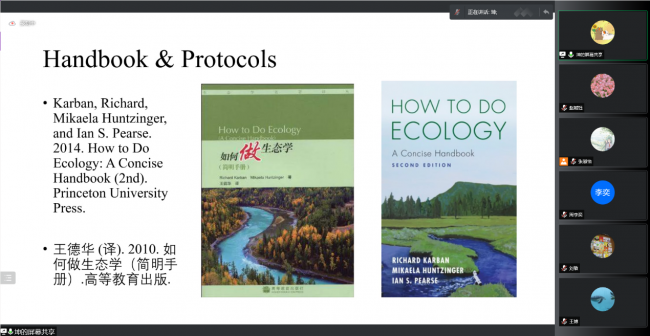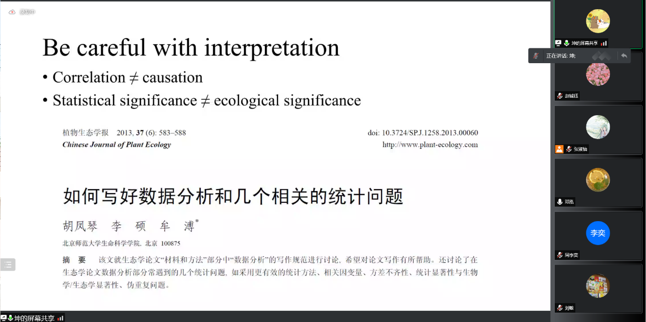 首先,宋坤老师为大家带来“浅谈数据分析”分享,他表示数据分析的第一步是想清楚数据的目的,第二步选择对应数据进行数据清洗,第三步开始进行数据分析。在分享数据分析的过程中,宋老师向大家展示“如何写好数据分析和相关的统计问题”,并且点出同学们论文中最容易犯的一个错误是拿均值来进行比较,忽略了显著性意义。之后宋老师为大家分享科教团队老师们推荐的书籍以及统计学相关的经典读物,例如《如何做生态学》、《地理信息系统教程》等,拓展同学们的知识储备。