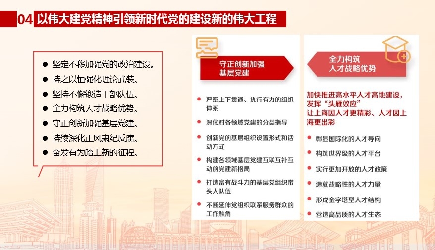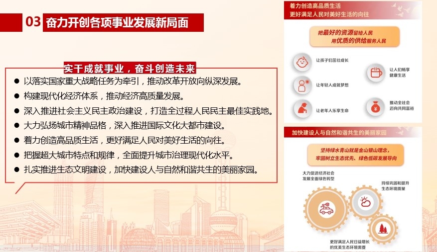 结合报告的主要内容,专题学习对报告的“牢记嘱托、砥砺奋进的五年”、“加快建设具有世界影响力的社会主义现代化国际大都市”、“奋力开创各项事业发展新局面”、“以伟大建党精神引领新时代党的建设新的伟大工程”四个方面进行详细学习和解读。